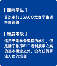 USACO(全称USA Computing Olympiad)是美国计算机奥林匹克竞赛,由 美国官方举办的中学生计算机编程与算法线上比赛,也是誉满全球的中学生计算 机编程竞赛。作为美国计算机奥林匹克国家队选拔赛,USACO备受美国名校关 注。相比其他学科竞赛,USACO因为门槛高,中美选手参与人数都不多,含金 量也更高。